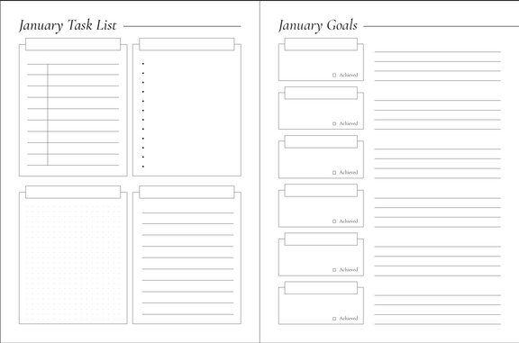 - Sections: End-of-week, month, quarter, and year reflection sections for self-assessment and strategy planning.