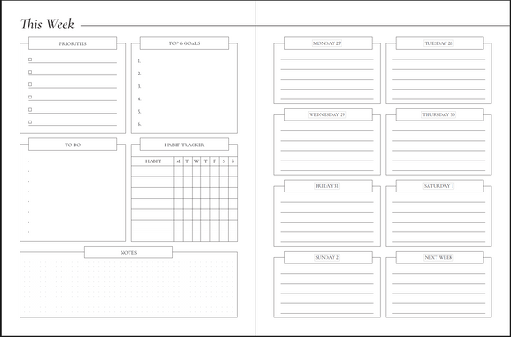 - Layout: Monthly and weekly spreads, goal-setting sections, reflection pages, and a weekly habit tracker.